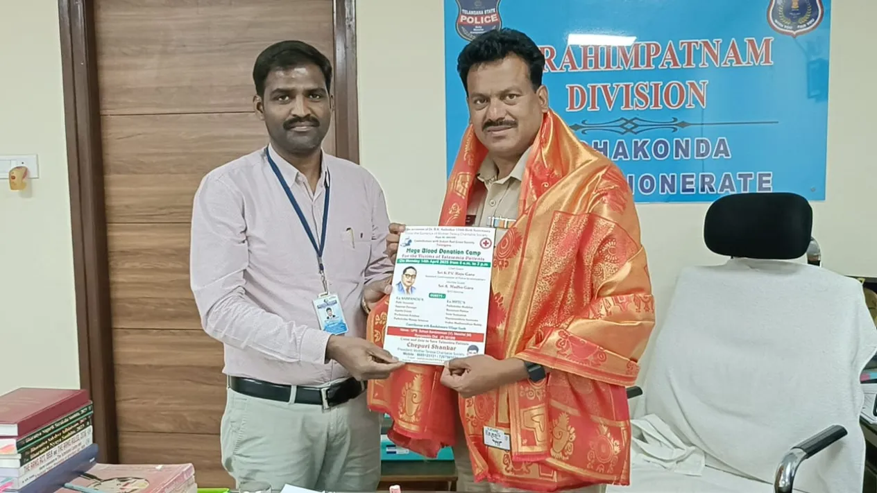 విశ్వంభర, ఇబ్రహీంపట్నం: డాక్టర్ బి.ఆర్ అంబేద్కర్ 134వ జయంతి సందర్భంగా మదర్ తెరిసా చారిటబుల్ సొసైటీ ఆధ్వర్యంలో ఇండియన్ రెడ్ క్రాస్ సొసైటీ తెలంగాణ వారి సహకారంతో 14/04/2025 సోమవారం రోజున ఉదయం 8 గంటల నుండి మధ్యాహ్నం 2 గంటలో వరకు బండలేమూరు విలేజ్ యూత్ వారి సహకారంతో నిర్వహిస్తున్న మెగా బ్లడ్ డొనేషన్ క్యాంపు కు ముఖ్య అతిథిగా అసిస్టెంట్ కమిషనర్ ఆఫ్ పోలీస్ ఇబ్రహీంపట్నం కె.పి.వి రాజు కి మదర్ తెరిసా చారిటబుల్ సొసైటీ అధ్యక్షులు చేపూరి శంకర్ ఇన్విటేషన్ కార్డు అందజేశారు. ఈ కార్యక్రమంలో పాల్గొన్న సొసైటీ సభ్యులు రాజు తదితరులు పాల్గొన్నారు.