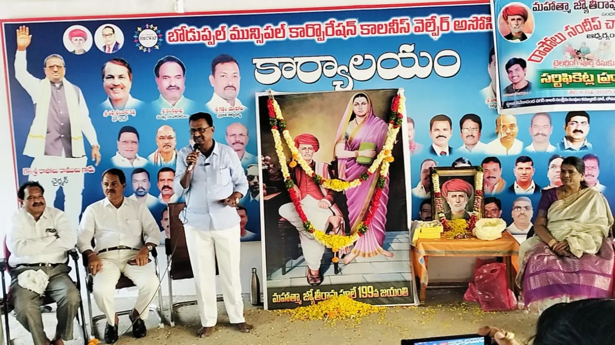 విశ్వంభర, మేడిపల్లి: బోడుప్పల్ మున్సిపల్ కార్పొరేషన్ కాలనీ సంక్షేమ సంఘాల కార్యాలయంలో మహాత్మా జ్యోతిరావు పూలే 198వ జయంతి వేడుకలు ఘనంగా నిర్వహించారు. ఈ కార్యక్రమానికి ముఖ్యఅతిథిగా ఫెడరేషన్ చైర్మన్ డాక్టర్ రాపోలు రాములు హాజరై మహాత్మ జ్యోతిరావు పూలే చిత్రపటానికి పూలమాలలు వేసి నివాళులర్పించారు. ఈ సందర్భంగా ఫూలే దంపతులను గుర్తు చేశారు. వారు సమ సమాజం కోసం చేసిన సాంఘిక సంక్షేమ, సంస్కృతిక కార్యక్రమాలను ఏనాటికి మరువబోమన్నారు. ఈ ఏప్రిల్ మాసంలోనే ఎంతోమంది మహనీయులు జన్మించారని తెలిపారు. 11 ఏప్రిల్ 1827న జన్మించిన జ్యోతి రావు పూలే తాను మరణించినా కానీ నేటికీ అందరిచే పూజింపబడుతున్నాడని కొనియాడారు. పూలే దంపతులు మహిళ విద్య ఉన్నతికే కృషిచేసిన పుణ్య దంపతులన్నారు. ఎన్నో కష్టనష్టాలకు ఓర్చి బడుగు బలహీన వర్గాలకు బాట చూపిన మహానీయులు అన్నారు. ఈ కార్యక్రమంలో సందీప్ చారిటబుల్ ట్రస్ట్ ఫౌండర్ రాపోలు సువర్ణ, ఫెడరేషన్ వైస్ చైర్మన్ ఎడ్ల శ్రీనివాస్ రెడ్డి, అధ్యక్షులు అబ్రహం లింకన్, ప్రధాన కార్యదర్శి గడ్డం యాదగిరి, ఫెడరేషన్ అడ్వైజర్స్, మెంబర్స్, మహిళా నాయకులు,తదితరులు పాల్గొన్నారు.