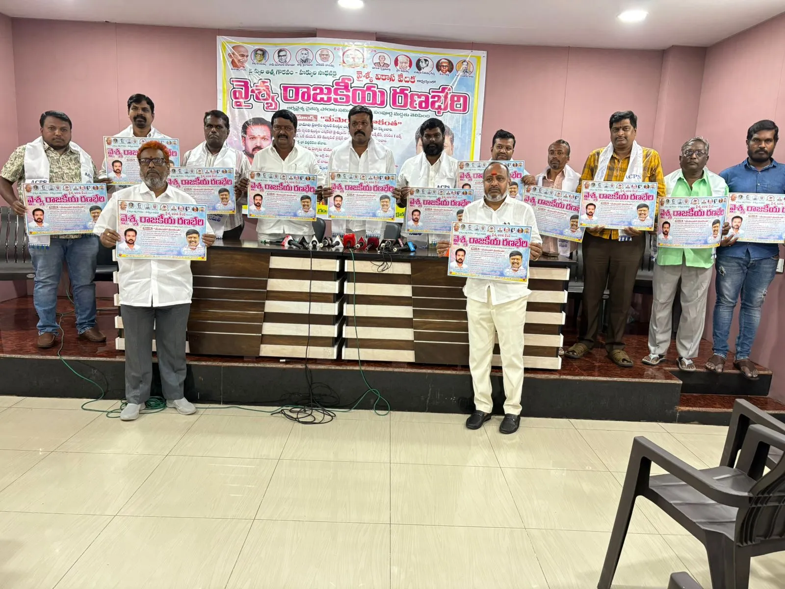 ప్రజా విశ్వంభర, హైద్రాబాద్ ; ఆగస్టు 3వ తేదీన హైదరాబాద్ నాంపల్లి ఎగ్జిబిషన్ గ్రౌండ్ లో వైశ్య వికాస వేదిక వ్యవస్థాపక అధ్యక్షులు డా. కాచం సత్యనారాయణ గుప్త ఆధ్వర్యం లో జరిగే వైశ్య రాజకీయ రణభేరి కార్యక్రమం ను విజయవంతం చేయాలనీ ఆర్యవైశ్య పోరాట సమితి అధ్యక్షుడు ప్రేమ్ గాంధీ ఆధ్వర్యంలో బషీర్ బాగ్ ప్రెస్ క్లబ్ లో ప్రెస్ మీట్ నిర్వహించారు. ఈ కార్యక్రమానికి వైశ్య వికాస వేదిక , రాజకీయ వైశ్య రణభేరి అధ్యక్షలు డా. కాచం సత్యనారాయణ గుప్త ముఖ్య అతిధిగా హాజరై పోస్టర్ ఆవిష్కరణ చేశారు. అనంతరం ఆయన మాట్లాడుతూ స్థానిక సంస్థల ఎన్నికల్లో వైశ్యుల వాటా తేల్చాల్సిందేనని అన్నారు. ఈ డబ్ల్యూ ఎస్ లో వర్గీకరణ తేవాలని అన్నారు. ఏ రాజకీయ పార్టీ అయినా వైశ్యులను గుడి , బడి వద్ద సేవ కార్యక్రమాలకు వాడుకుంటున్నారే తప్ప, రాజకీయంలో సీట్లు కేటాయించడం లేదని అన్నారు. రాష్ట్ర ప్రభుత్వం ప్రకటించే నామినేటెడ్ పదవుల్లో వైశ్యులకు తగిన ప్రాధాన్యత కల్పించాలి అని అన్నారు. ఈ కార్యక్రమంలో రంగారెడ్డి జిల్లా అధ్యక్షులు సతీష్ గుప్తా, భాగ్యనగర్ అధ్యక్షులు శంకర్ , మీడియా కన్వీనర్ ఉదయ్ కుమార్ , నాయకులు దొంతు చెన్నకేశవ శెట్టి, నాగరాజు, సంతోష్, విజయ్, రాజ్ కుమార్, చైతన్యకుమార్ తదితరులు పాల్గొన్నారు.